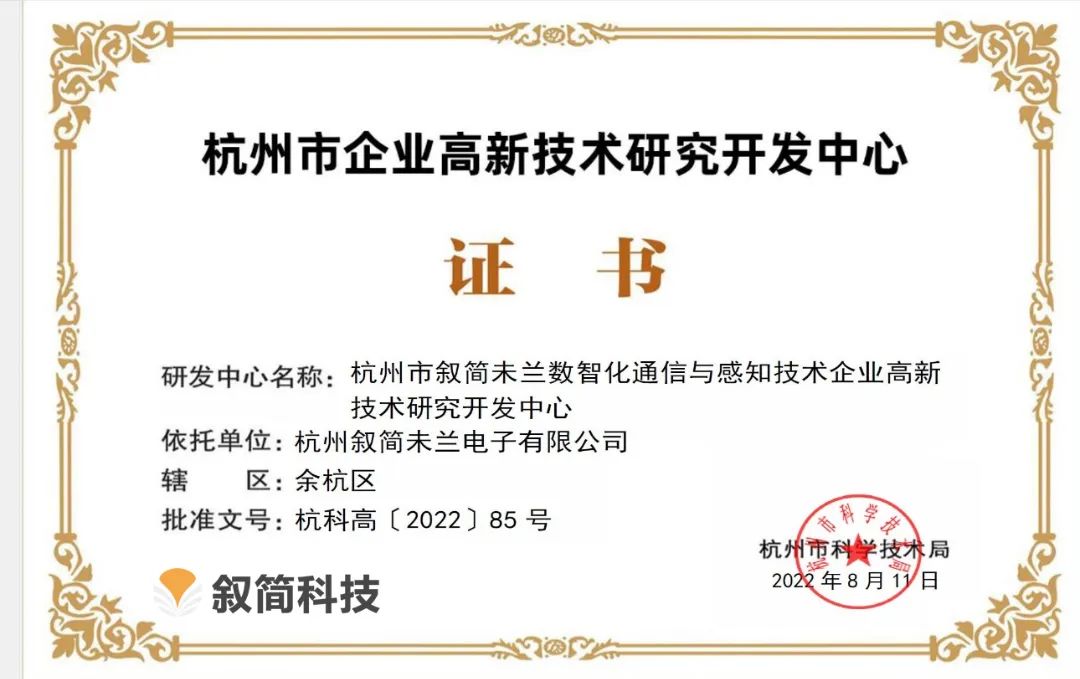杭州敘簡(jiǎn)未蘭電子有限公司申報(bào)的“杭州市敘簡(jiǎn)未蘭數(shù)智化通信與感知技術(shù)企業(yè)高新技術(shù)研究開發(fā)中心”經(jīng)過杭州市科技局組織的專家組現(xiàn)場(chǎng)實(shí)地考察和評(píng)審,順利通過各項(xiàng)審核標(biāo)準(zhǔn),符合研發(fā)中心建設(shè)條件,成功獲得杭州市企業(yè)高新技術(shù)研究開發(fā)中心認(rèn)定!