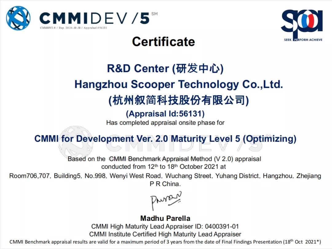 敘簡科技獲得CMMI5級認證,軟件能力成熟度模型集成最高級別認證。
