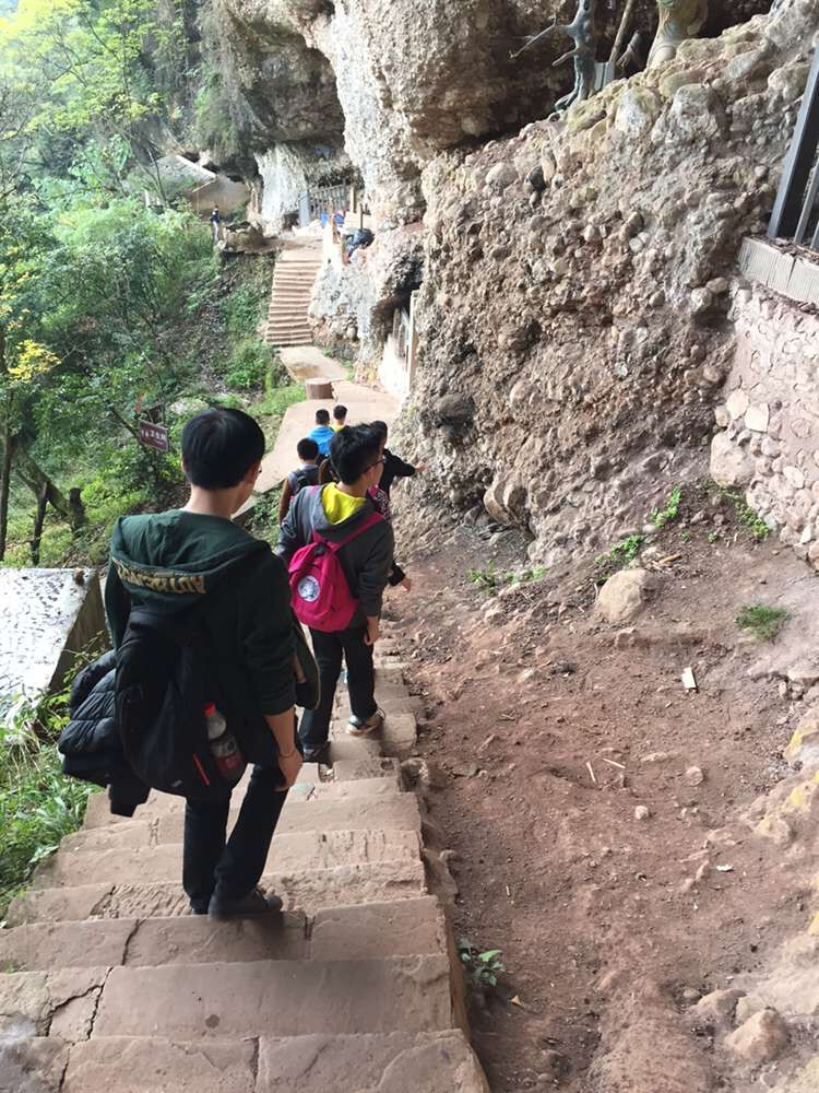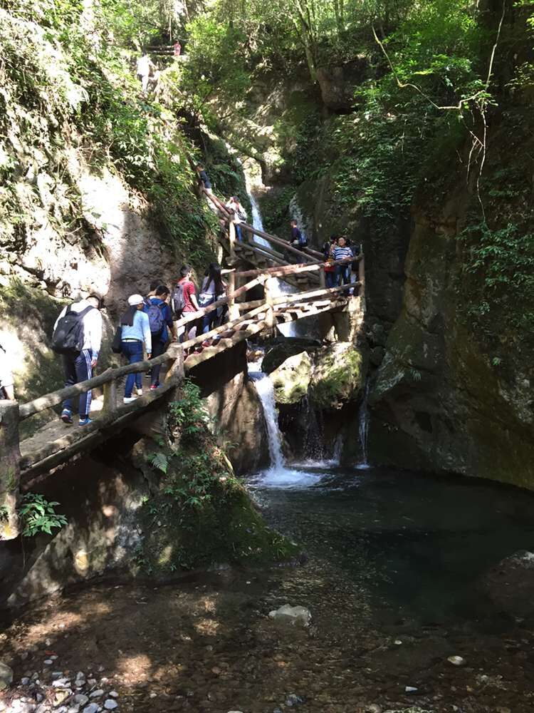 阳光明媚中,长久蜗居城市烟尘中的我们兴致昂扬的期待着登山之旅~没多久船转过山弯,豁然开朗就是山脚下了。上山的过程是愉悦而艰辛的,美景相伴,山峦叠嶂,石阶高低不桎,水声泠泠,美不胜收。爬了两个多小时终于开始半场休息了~一群人窝在半悬空的山壁亭子里开玩笑,缓解登山的疲倦,仅剩一个女汉子还在跟着七个大男人一起登顶了,点赞~