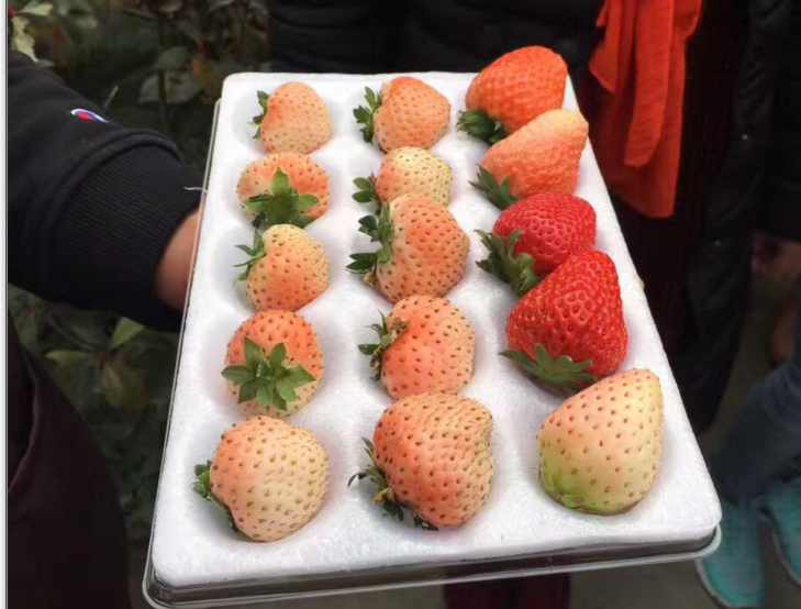 农家菜果然和外面的菜不一样,每道菜都带着菜本身的那种鲜味,大家都进行了光盘行动。午饭过后,农场主人给我们讲解了草莓的品种,让我们看到了以前从未看到过得品种,此刻大家的眼睛都发着光恨不得马上进入棚内去品尝,也不管肚子塞不塞的下啦。于是乎花朵们拎着篮子迫不及待的进入棚内采摘,只听到大家的叫喊声,真是太,太,太好吃了,又甜又凉又爽口,果然与外面的与众不同,特别是白中透着淡粉的“小桃熏”,让我们彻底的爱上了它。