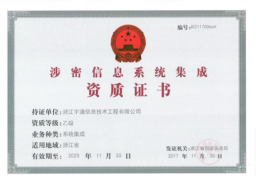 凭借稳健的经营业绩、健全的保密制度、完善的保密环境,经国家保密局对体系文件、管理制度、涉密工作现场等的严格审查与评估,叙简科技旗下子公司浙江宇通信息技术工程有限公司得到专家和资质委员会的高度评价,顺利通过了涉密信息系统集成资质认证。