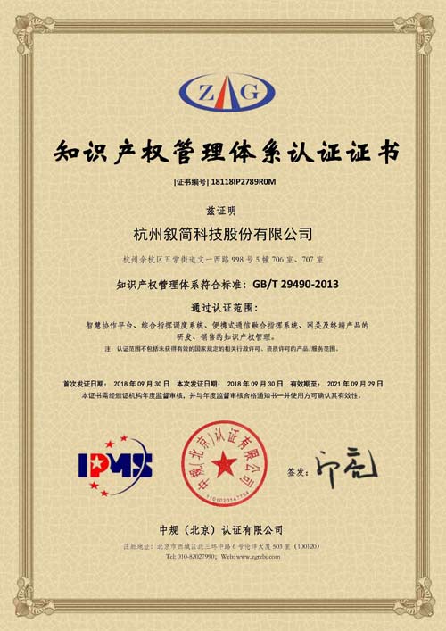 本次荣获的知识产权管理体系认证与叙简科技已获得的ISO9001质量管理体系认证、ISO14001环境管理体系认证、ISO27001信息安全管理体系认证、OHSAS18001职业健康安全管理体系认证、GB/T27922-2011商品售后服务认证共同组成完备的企业管理体系。今后,叙简科技将进一步发挥自主知识产权优势,为公共安全领域的“中国创造”贡献力量。