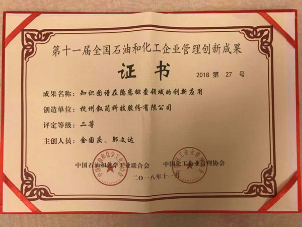 叙简科技的创新项目《知识图谱在隐患排查领域的创新应用》,经过中国石油和化工业联合会及中国化工企业管理协会严格的初审、复审和专家委员会评审后,被评定为第十一届石油和化工行业级企业管理创新成果二等奖。