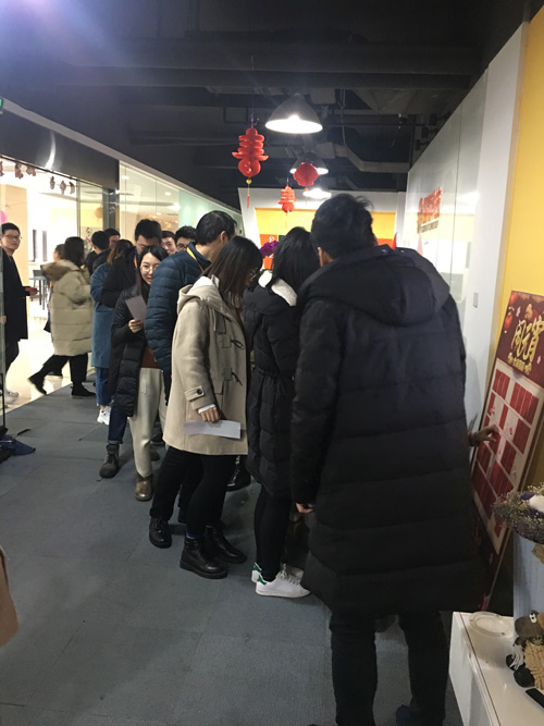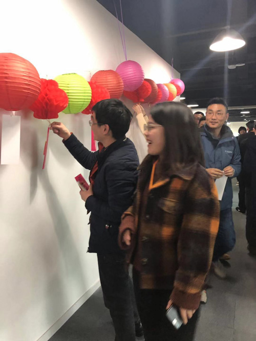 在午休之前,工作人员就忙碌地开展准备工作,在公司走廊进行灯笼的布置和灯谜的摆放。这次活动,还特意准备了一个红包墙,红包里面有不一样的惊喜。答对灯谜的小伙伴可以随机抽取一个红包,来为新的一年谋个彩头。午休还未开始,大家就已经开始摩拳擦掌,跃跃欲试。想马上摘取一条灯谜进行竞猜,都非常期待红包墙的惊喜。在万众期待下,午休的歌声响起,大家都放弃先就餐,纷纷来到灯笼区域挑选自己心仪的灯谜,十分热闹。