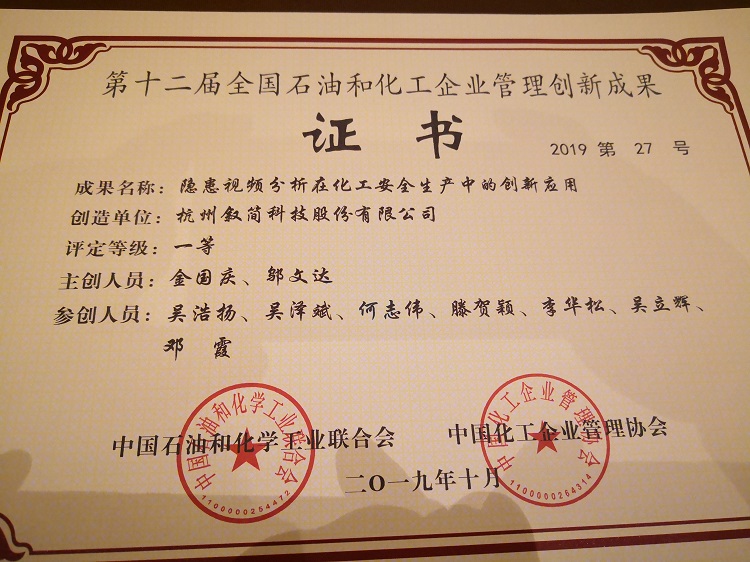 杭州叙简科技股份有限公司创新项目《隐患视频分析在化工安全生产中的创新应用》,经过层层筛选与评定,荣获第十二届全国石油和化工企业管理创新成果一等奖!中国石油和化学工业联合会顾问、原党委常务副书记曾坚及中国石油和化学工业联合会副会长、中国化工企业管理协会会长王述纲亲自上台授予叙简科技创新成果证书。