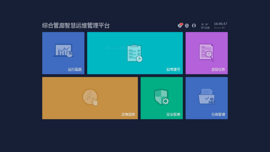 综合管廊作为城市的“生命线”,运维管理更趋向于“信息化、可视化、智能化”,逐步实现全生命周期、标准化管理,同时为全时段运维提供技术保障。综合管廊统一管理平台积极响应国家政策并依据《城市综合管廊工程技术规范GB50838-2015》、《城镇综合管廊监控与报警系统工程技术标准GB/T51274-2017》等国家标准,构建“全方位、全过程、全时段、全角度”的地下综合管廊智慧管控系统。该系统具有强大的系统融合能力,可以对接环境与设备监控系统、安全防范系统、通信系统、火灾自动报警系统等,并在上层构建统一指挥平台,主要包括日常值守、巡检维护、监测预警、安全管理、应急指挥、行政管理六大模块,最终达到运维监管实时化、运行监测实时化、动态展示实景化的目标。