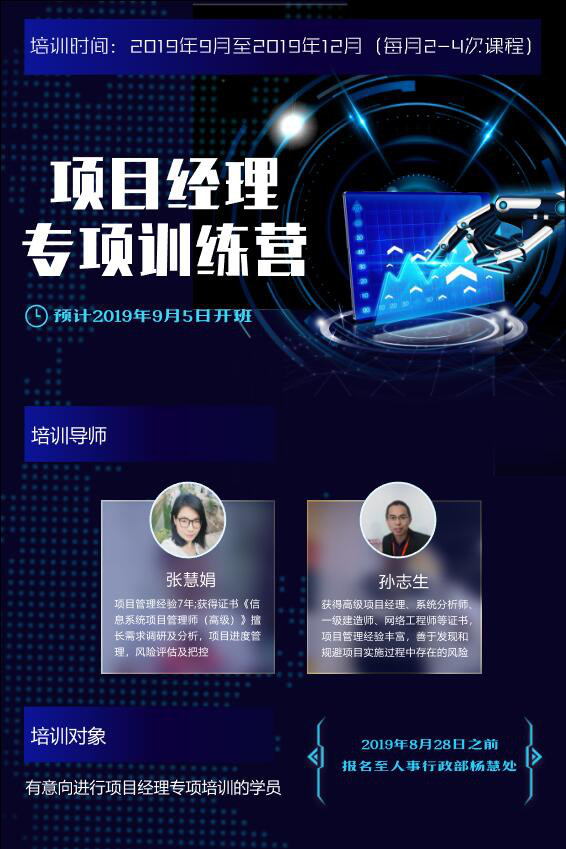 2019年9月5日,为期三个多月的项目经理训练营正式开班!培训导师是我们具有丰富项目管理经验的张慧娟老师和孙志生老师。报名参加培训的22位小伙伴,初聚八楼会议室,开始了自己的第一次培训课程。