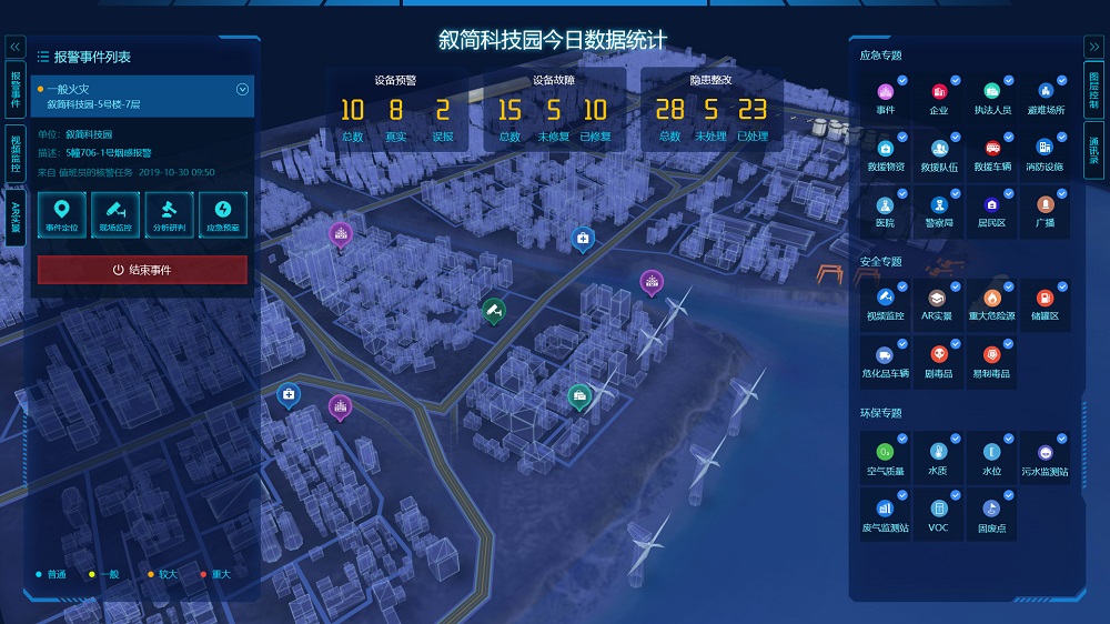 在此次大会中,叙简科技将要展示的智慧化工园安全应急一体化平台,提供包括综合态势、一张图应用、应急救援、视频应用、企业安全监管、综合安防等多个功能模块,提升化工园区的安全水平、应急能力,为化工园的持续、健康、长远发展提供保障。