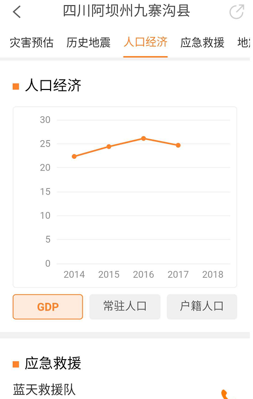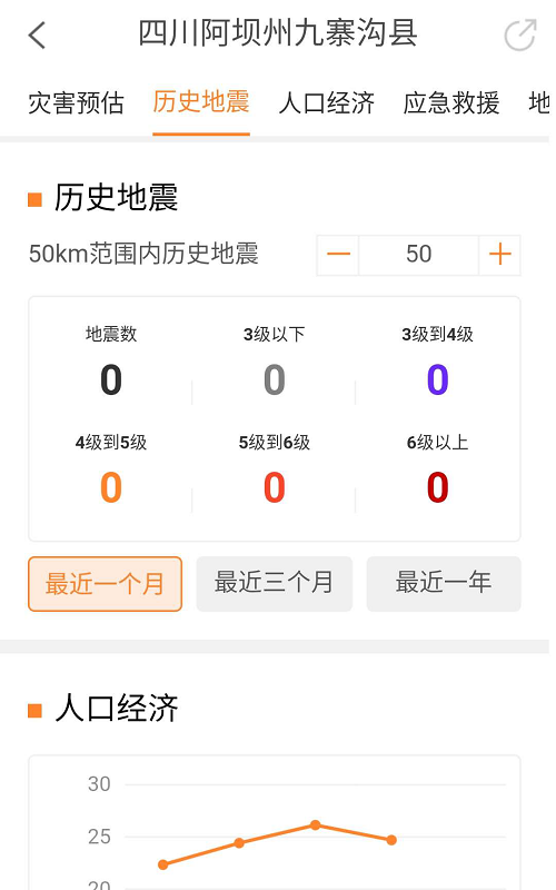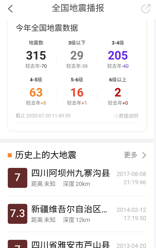 应急速报APP地震专题部分也对本年度全国的地震数据进行统计汇总,包括年度内的地震总数、地震的震级区间分布以及较上一年的数目增减。另外,也可查看所有历史大地震的数据列表,以及在地图上的位置分布等,针对某个地震数据源,可以根据距离范围、时间段查询相关的历史地震数据,同时对该地区的GDP、常住人口、户籍人口等进行列表展示。