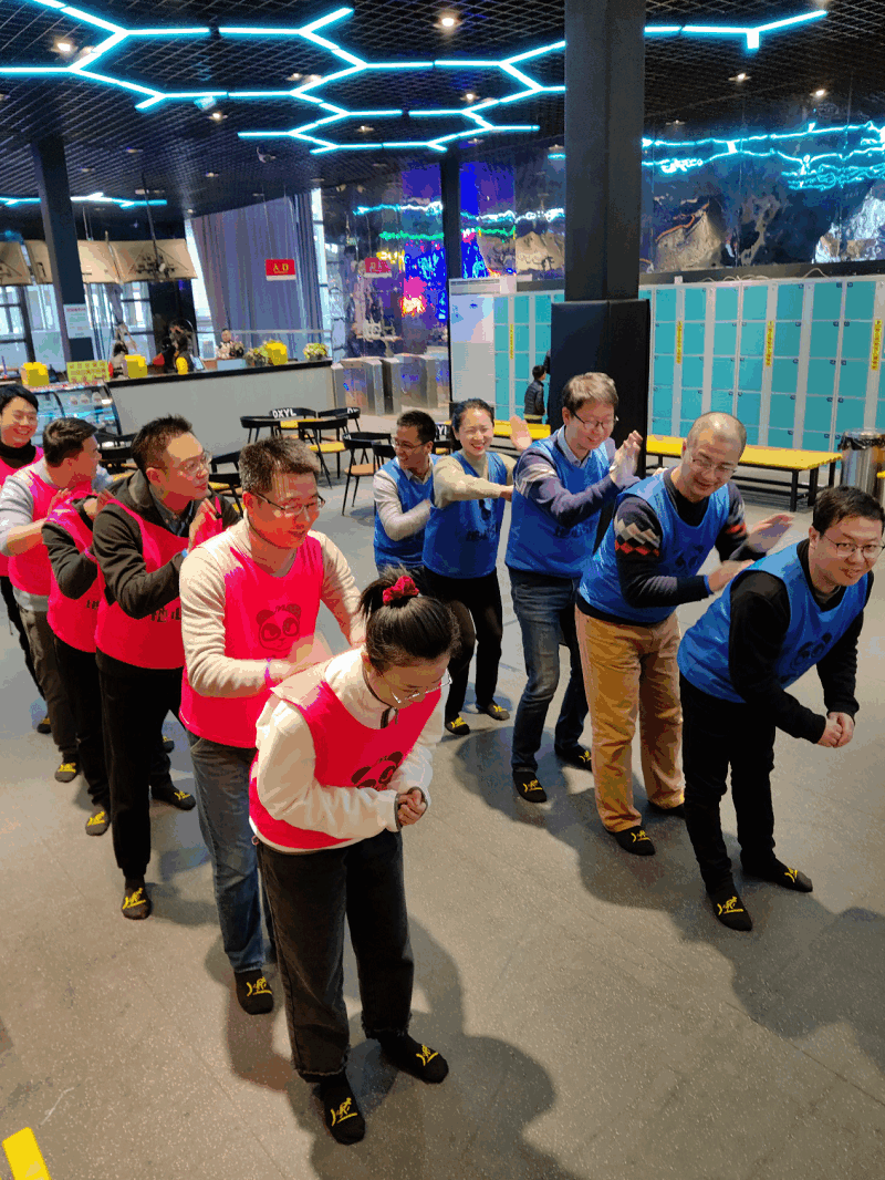 活动前,先来进行简单的热身,两组选手各自排成一列小火车,给队友按摩松筋,互帮互助,提前预热。