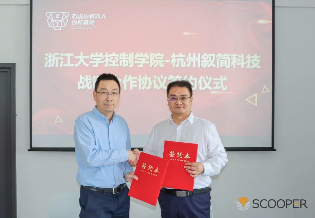 5月27日下午,浙江大学控制科学与工程学院(以下简称“浙大控制学院”)、杭州叙简科技股份有限公司(以下简称“叙简科技”)的“产教融合、协同育人”战略合作签约仪式在石虎山机器人创新基地举行。双方本着诚信合作、资源共享、优势互补的原则,将在科研创新、教学实践、人才培养、聘任导师、成果推广等方面进行战略性合作。