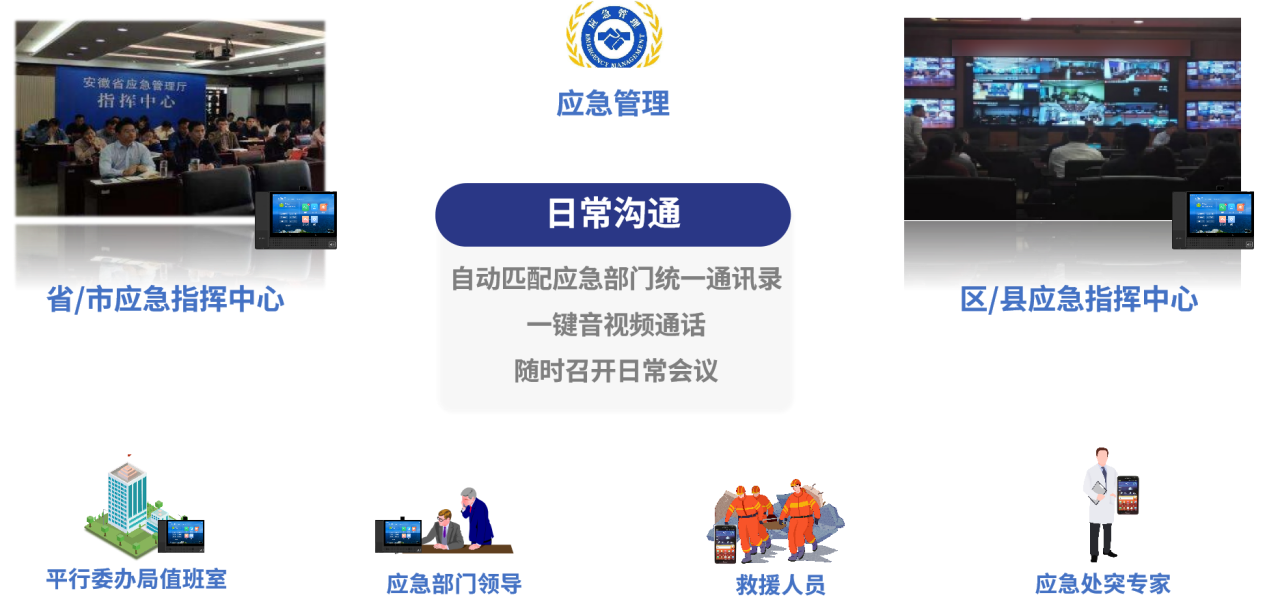 桌面终端支持自动匹配应急部门统一通讯录,提供直观明晰的多层级通讯录显示,可部署于应急指挥中心、各职能部门办公室、各委办局值班室等地。应急部门领导通过桌面指挥终端即可实现与各部门人员的一键音视频通话,随时可以召开日常例会、应急会议。实现应急管理机构内部成员之间,与委办局、各级指挥中心、前端人员、应急专家之间的日常事宜联络沟通。