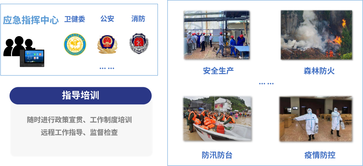 桌面终端可作为远程培训终端,部署于应急指挥中心、各委办局等地。支持一键发起会议,可随时针对安全生产、森林防火、防汛防台、疫情防控等场景,进行政策宣贯、工作制度培训、远程工作指导、监督检查等。