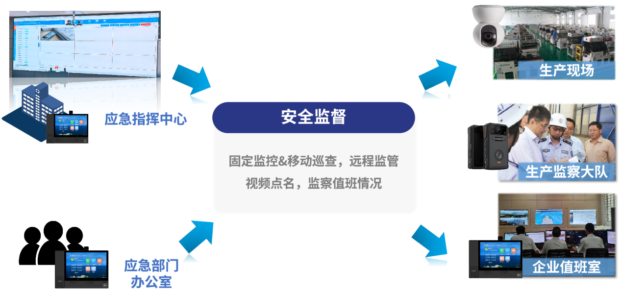 在安全生产管理中,应急管理部门对于生产企业的日常安全检查必不可少。桌面终端可作为安全监管话机,部署于应急指挥中心、应急部门办公室等地,配合前端视频监控、穿戴式单兵,可实现对企业生产现场、应急管理安全生产监察大队成员情况的远程监督。