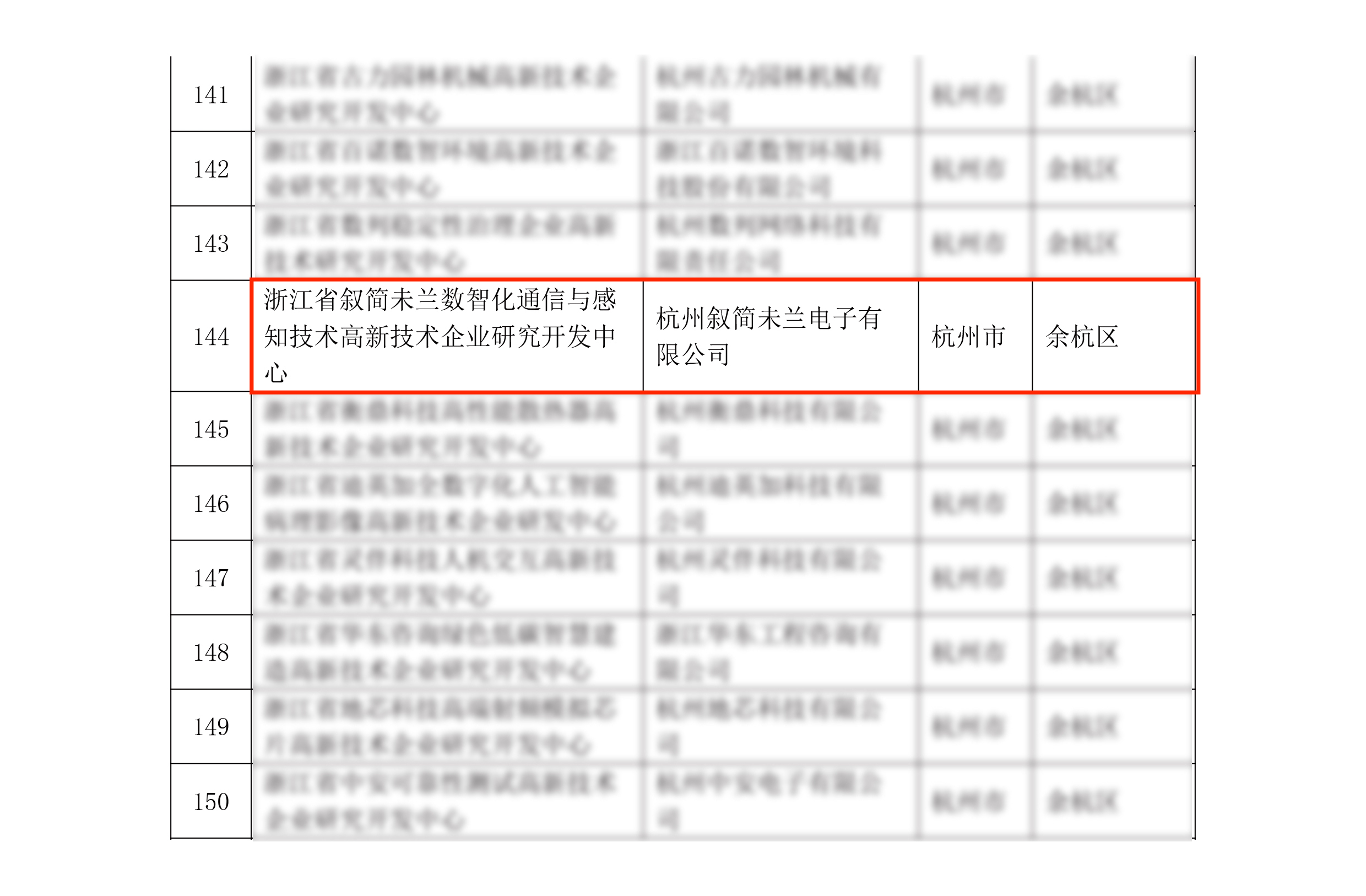 浙江省叙简未兰数智化通信与感知技术高新技术企业研究开发中心
