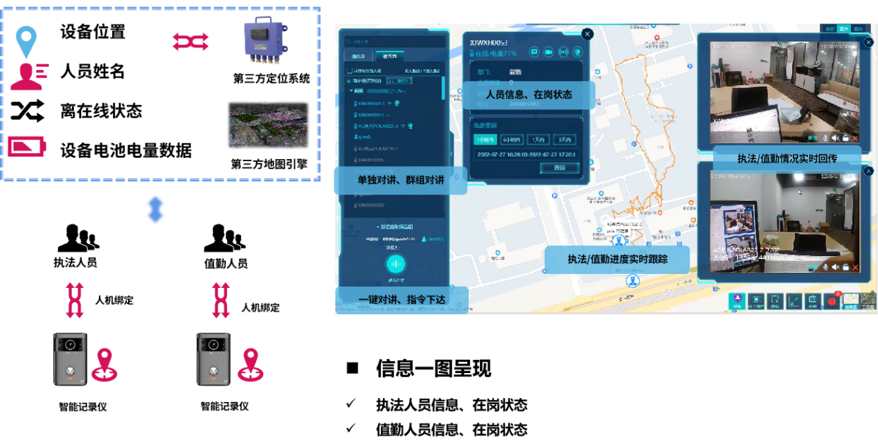 前端?員佩戴智能記錄儀,能夠在系統(tǒng)上實(shí)時(shí)顯??員姓名、設(shè)備位置、在離線(xiàn)狀態(tài)、設(shè)備電池電量數(shù)據(jù)。可結(jié)合第三?定位系統(tǒng)或地圖引擎使?,實(shí)現(xiàn)前端?員信息?圖呈現(xiàn)。