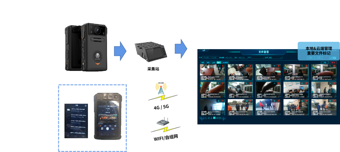 前端人員佩戴的智能記錄儀可將現(xiàn)場(chǎng)數(shù)據(jù)存儲(chǔ)在本地終端,也可通過(guò)4G/5G/WIFI/MESH等無(wú)線(xiàn)傳輸方式實(shí)時(shí)回傳至后端存儲(chǔ)。設(shè)備同時(shí)可搭配采集站使用(桌面式/壁掛式/立式),實(shí)現(xiàn)現(xiàn)場(chǎng)執(zhí)法記錄或作業(yè)記錄的自動(dòng)采集和回傳存檔。