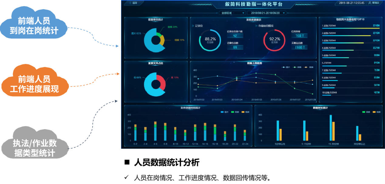系統(tǒng)支持對(duì)人員、單位、執(zhí)法/作業(yè)類(lèi)型按多維度(工作時(shí)間、數(shù)量、類(lèi)型等)進(jìn)行綜合考核分析,為績(jī)效監(jiān)督部門(mén)提供詳細(xì)的考評(píng)依據(jù)。