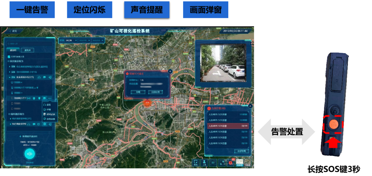 執(zhí)法過(guò)程或作業(yè)過(guò)程中存在異常情況時(shí),前端人員可長(zhǎng)按智能記錄儀的“SOS”按鈕,一鍵告警反饋,指揮中心可實(shí)時(shí)處理。系統(tǒng)上將進(jìn)行定位閃爍、聲音提醒及畫(huà)面彈窗,提醒指揮人員進(jìn)行遠(yuǎn)程查看及處置。