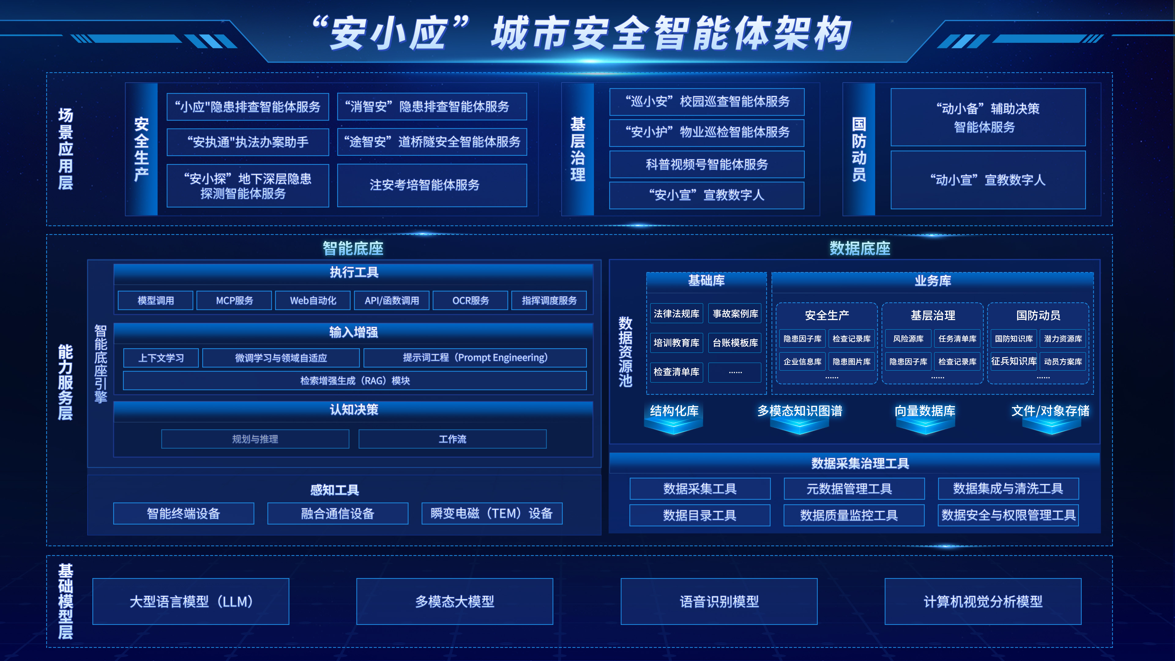 “安小應(yīng)” 城市安全智能體采用三層架構(gòu)設(shè)計(jì),由基礎(chǔ)模型層、能力服務(wù)層、場(chǎng)景應(yīng)用層構(gòu)成,形成從模型支撐、能力中樞到業(yè)務(wù)落地的完整技術(shù)體系。 基礎(chǔ)模型層:匯聚大語(yǔ)言模型、多模態(tài)模型、視覺(jué)分析模型等各類(lèi)核心 AI 模型,為全場(chǎng)景智能應(yīng)用提供統(tǒng)一、高效的基礎(chǔ)算法與模型支撐。 能力服務(wù)層:作為智能體核心中樞處理單元,包含智能底座與數(shù)據(jù)底座兩大組件。智能底座作為智能體 “大腦”,依托智能終端、融合通信、瞬變電磁等多元感知設(shè)備,實(shí)現(xiàn)全域數(shù)據(jù)精準(zhǔn)感知;結(jié)合行業(yè)專(zhuān)屬數(shù)據(jù)底座,完成業(yè)務(wù)問(wèn)題深度認(rèn)知、知識(shí)推理、智能決策與高效執(zhí)行,輸出適配上層場(chǎng)景的精準(zhǔn)化服務(wù)能力。 場(chǎng)景應(yīng)用層:聚焦安全生產(chǎn)、基層治理、國(guó)防動(dòng)員三大核心板塊,重點(diǎn)落地隱患排查、輔助決策、宣教數(shù)字人等核心應(yīng)用,為城市安全運(yùn)行提供一體化、實(shí)戰(zhàn)化的智能服務(wù)。